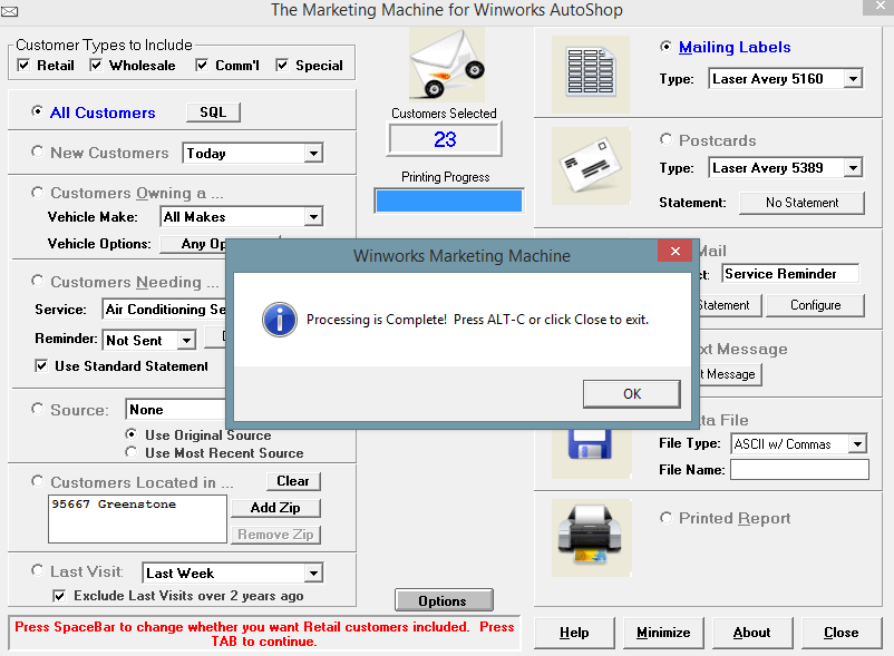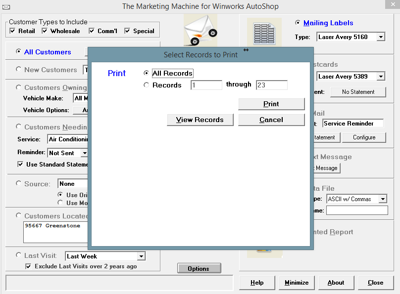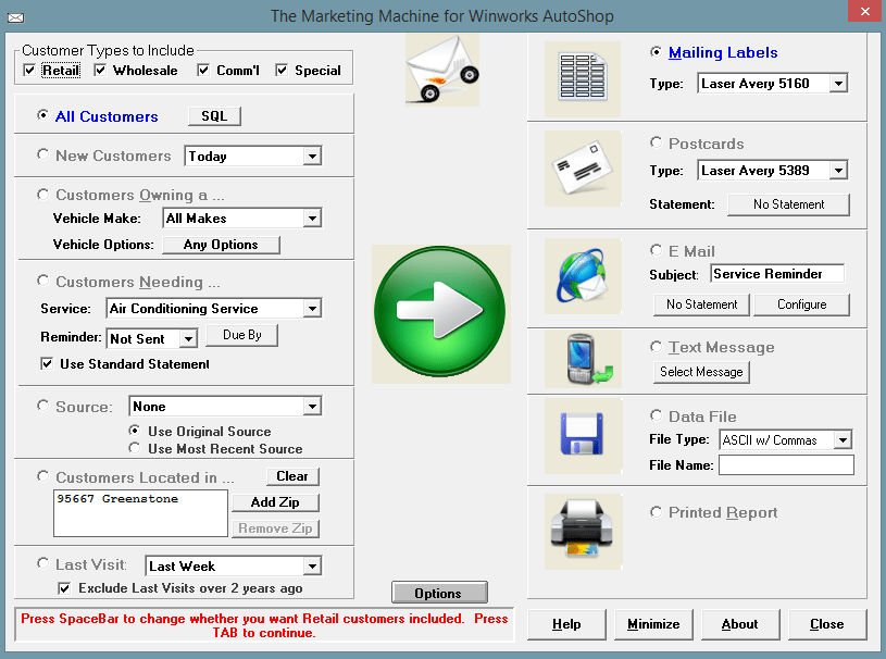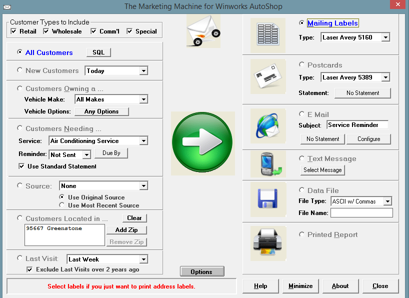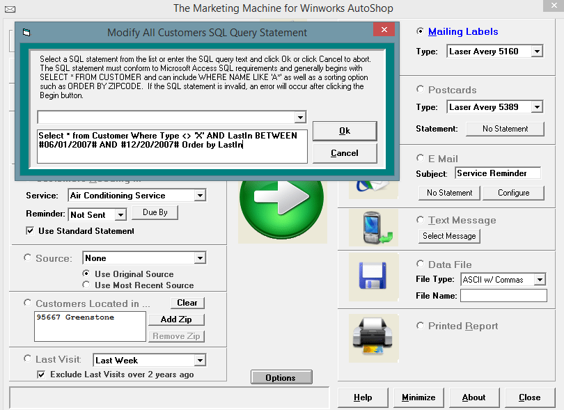 Included in the Professional and Premium editions of the Winworks AutoShop Management program, is the AutoShop Marking Machine. There are so many prebuilt ways to extract customers into data files, postcards, emails and more. One of the most popular features in the Marking Machine is the ability to use SQL (Structured Query Language). Now if you are not that familiar with computers you may not know what that means. In the simplest terms, it is a way to search the deepest parts of your database and get the information you want and need. At the bottom of this page is a list of our prebuilt SQLs. All you would need to do it first, open Marketing Machine. Then in the upper left hand corner Click the SQL button. And copy and paste the SQL you would like in there. Making sure to change the items such as dates and zip codes, the items in bold. (being sure to not change anything else) Click “OK” and select the output method of the data you requested, and click the green arrow.