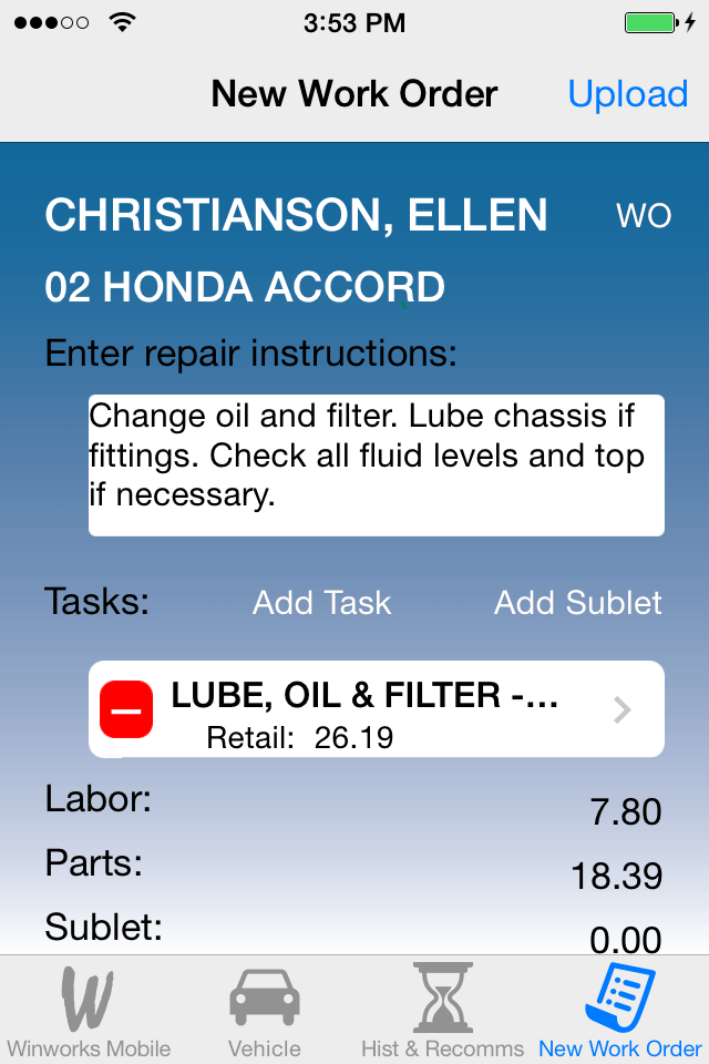 SEND to AutoShop- Once the tasks have been added, just press upload! The work order will be waiting for you in your AutoShop Management system.